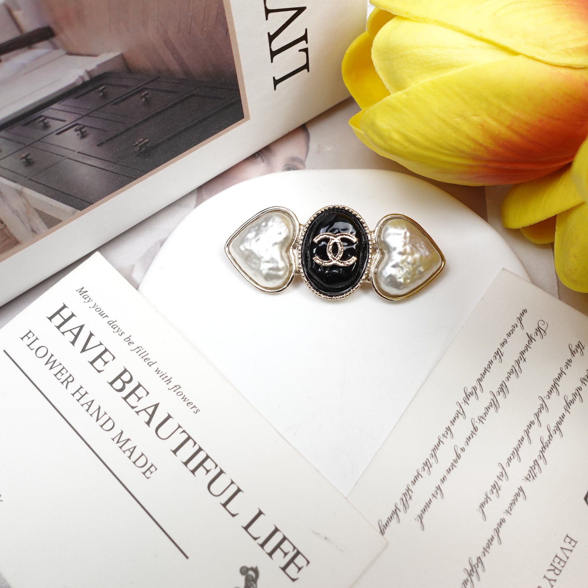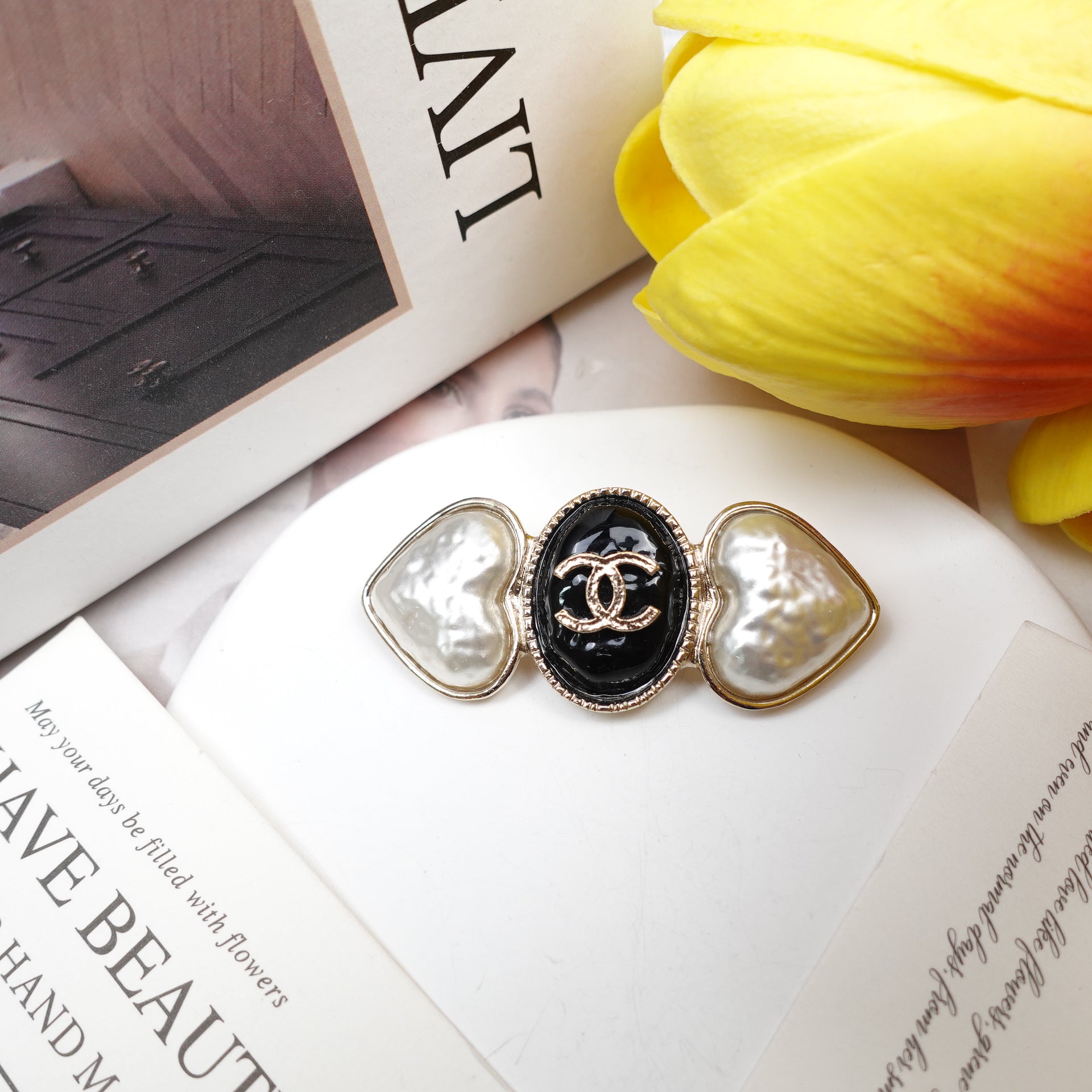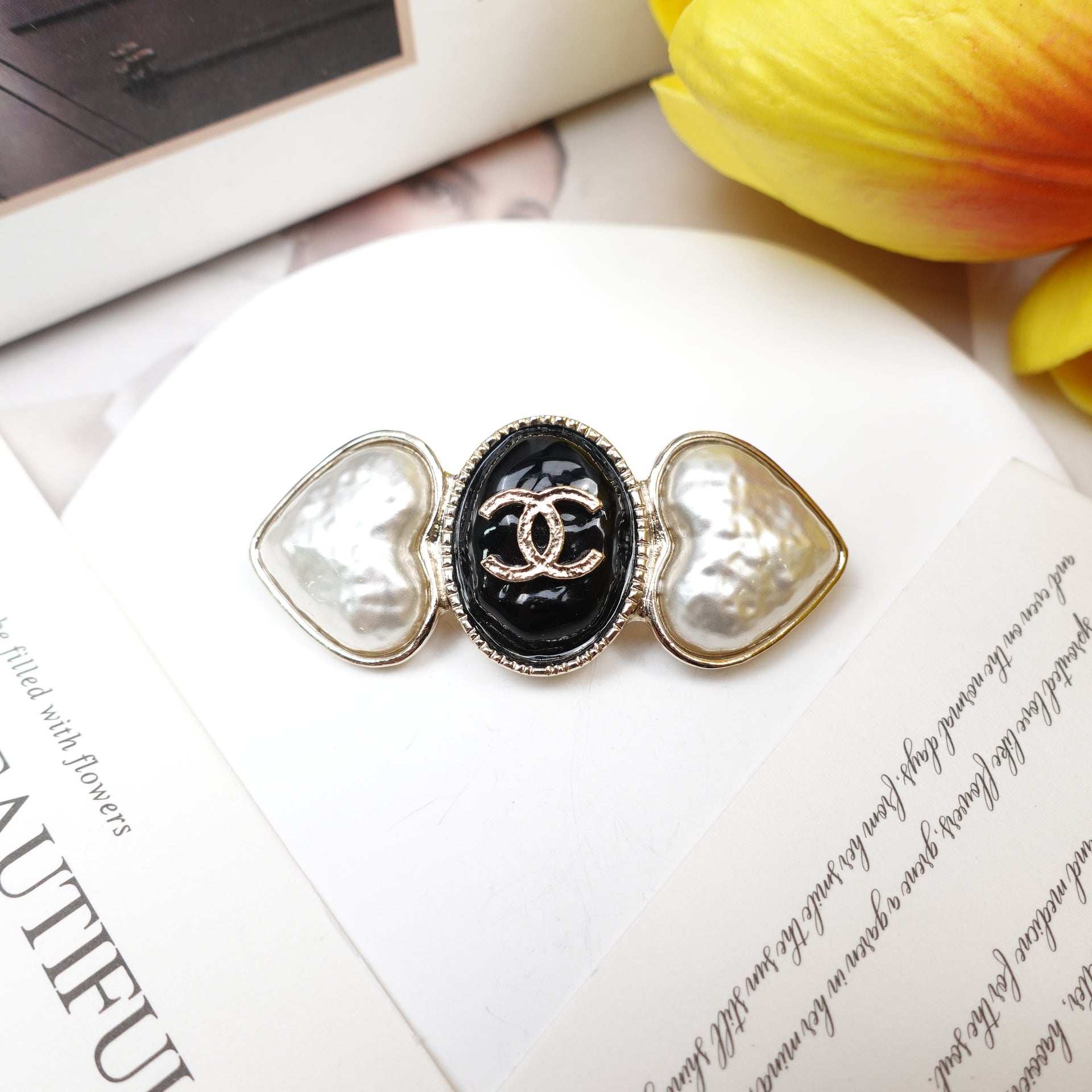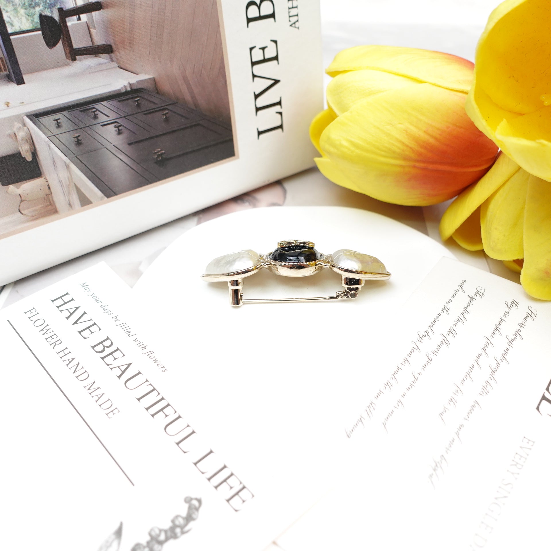 Pre-Owned Chanel Gold Tone Metal Black Resin Pearl CC Brooch